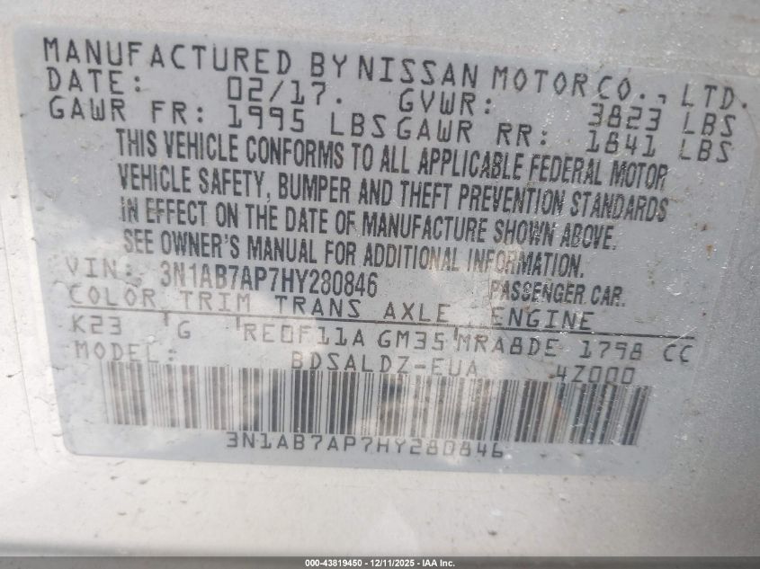 2017 NISSAN SENTRA 2017 року Бензин, 1.8, Передний привод, vin - 3N1AB7AP7HY280846 из США