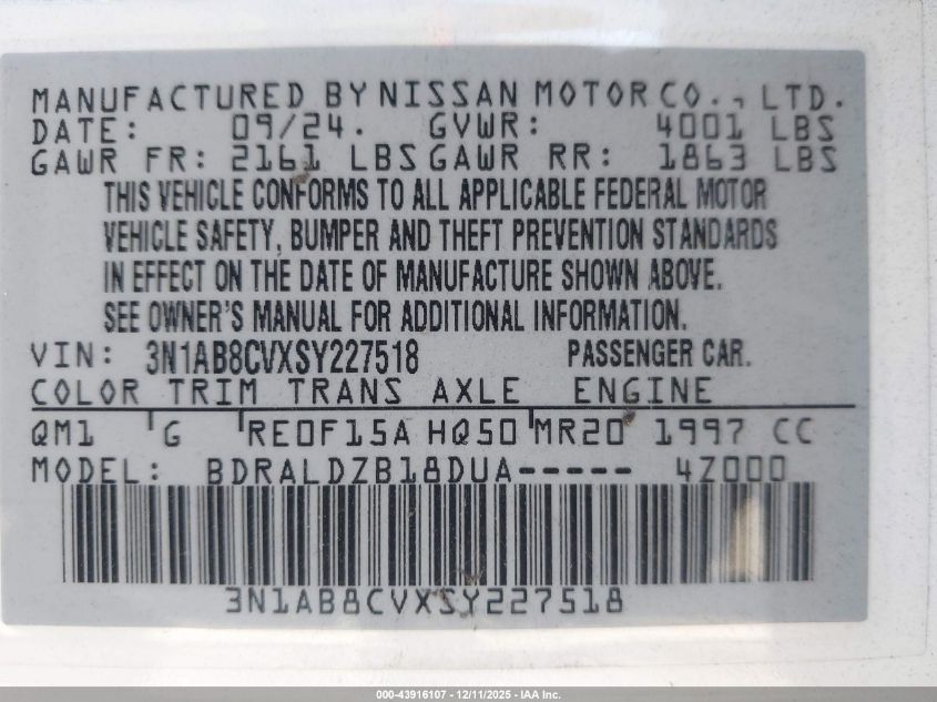 2025 NISSAN SENTRA 2025 року Бензин, 2.0, Передний привод, vin - 3N1AB8CVXSY227518 из США