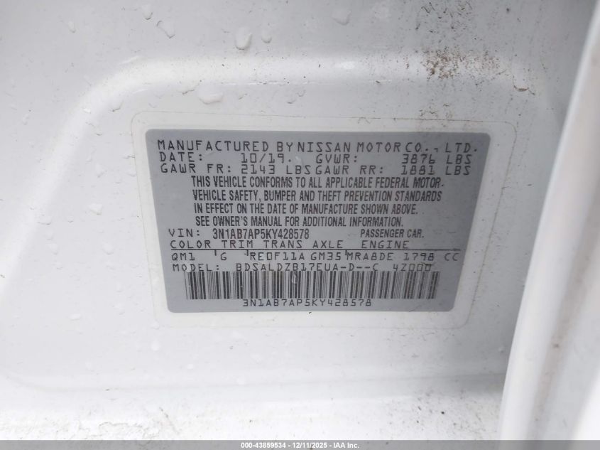 2019 NISSAN SENTRA 2019 року Бензин, 1.8, Передний привод, vin - 3N1AB7AP5KY428578 из США