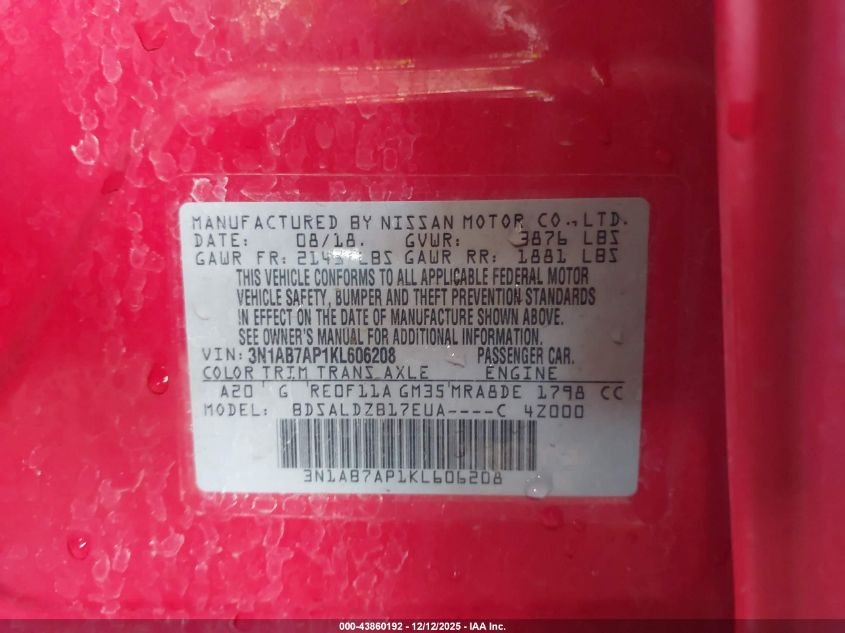 2019 NISSAN SENTRA 2019 року Бензин, 1.8, Передний привод, vin - 3N1AB7AP1KL606208 из США