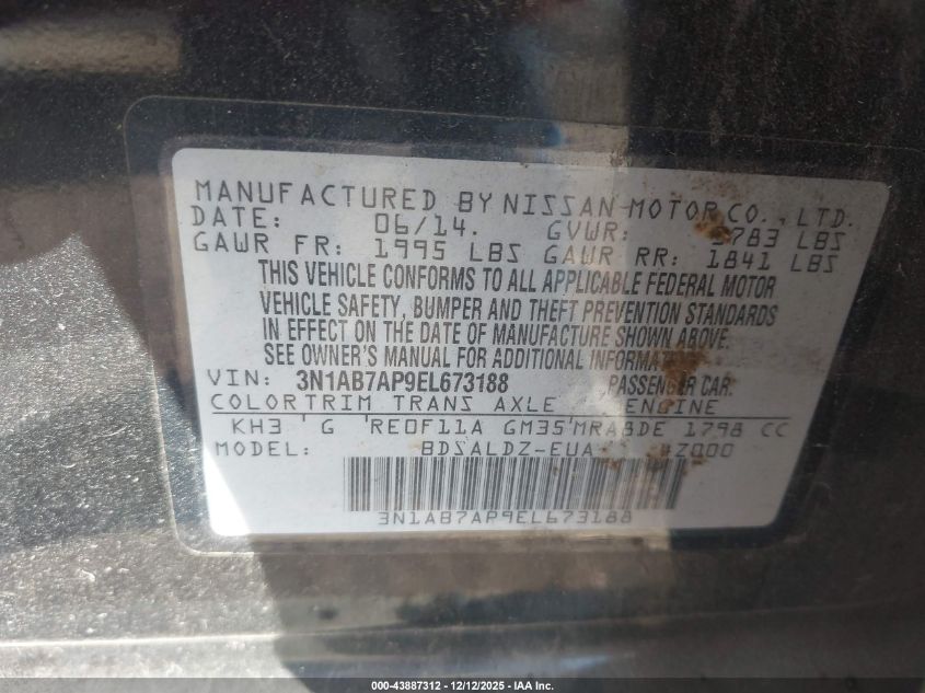 2014 NISSAN SENTRA 2014 року Бензин, 1.8, Передний привод, vin - 3N1AB7AP9EL673188 из США