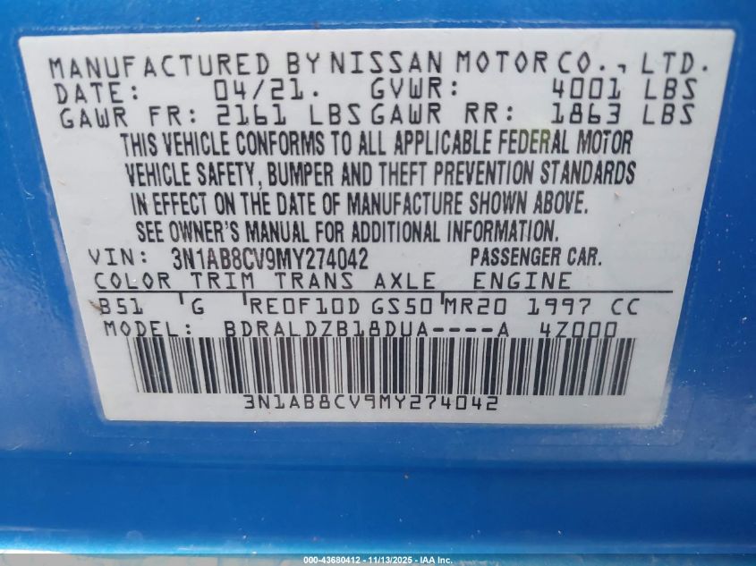 2021 NISSAN SENTRA 2021 року Бензин, 2.0, Передний привод, vin - 3N1AB8CV9MY274042 из США
