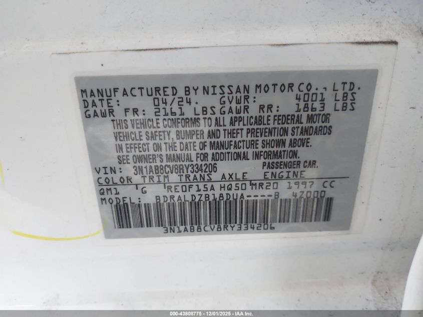 2024 NISSAN SENTRA 2024 року Бензин, 2.0, Передний привод, vin - 3N1AB8CV8RY334206 из США