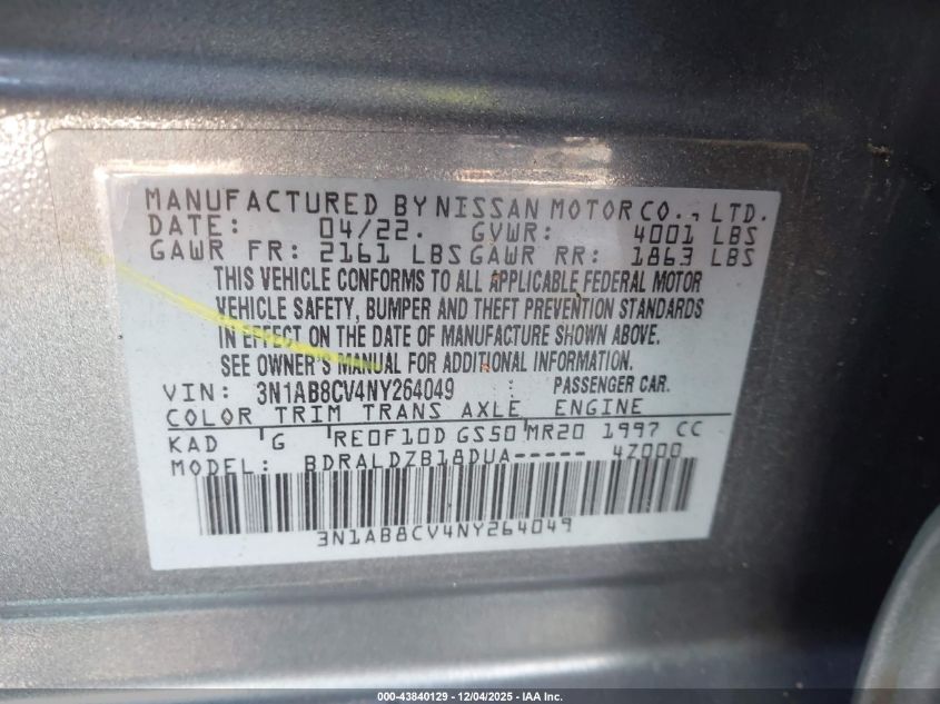 2022 NISSAN SENTRA 2022 року Бензин, 2.0, Передний привод, vin - 3N1AB8CV4NY264049 из США