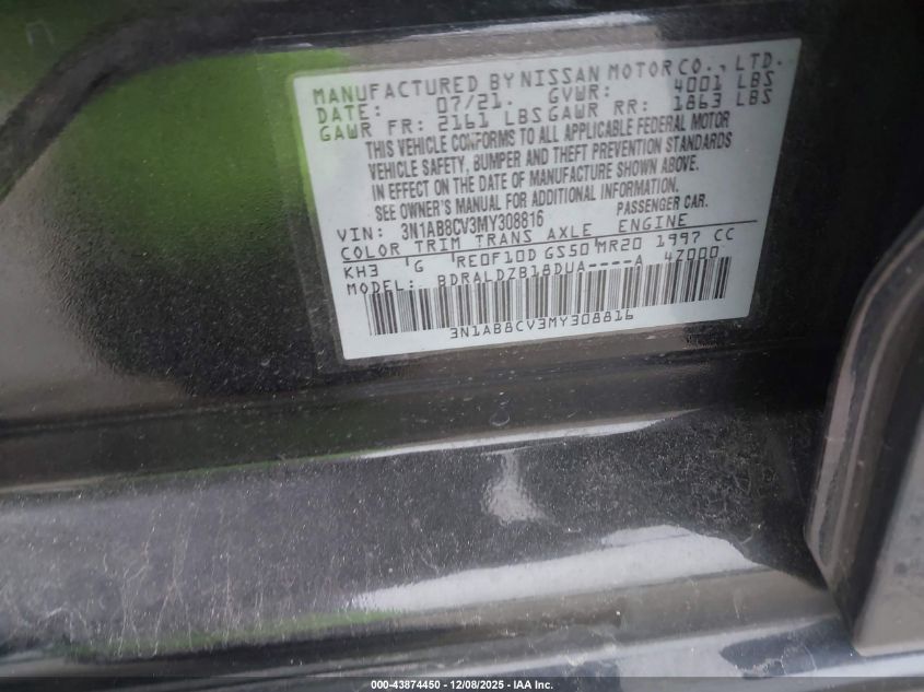 2021 NISSAN SENTRA 2021 року Бензин, 2.0, Передний привод, vin - 3N1AB8CV3MY308816 из США