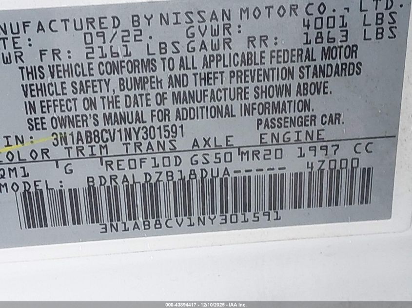 2022 NISSAN SENTRA 2022 року Бензин, 2.0, Передний привод, vin - 3N1AB8CV1NY301591 из США