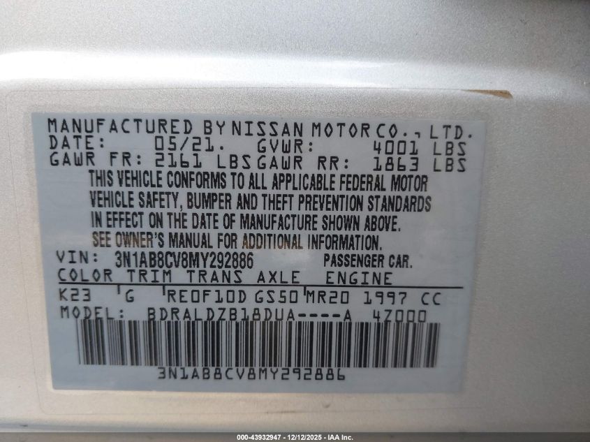 2021 NISSAN SENTRA 2021 року Бензин, 2.0, Передний привод, vin - 3N1AB8CV8MY292886 из США