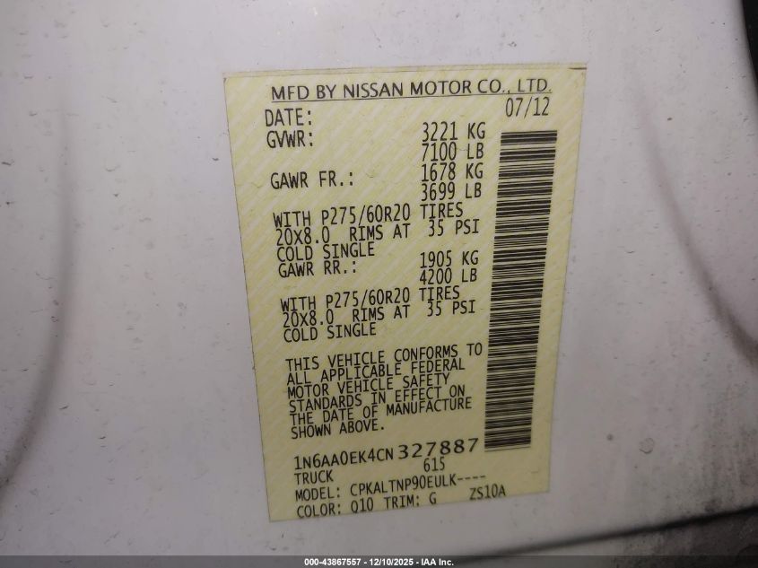 2012 NISSAN TITAN 2012 року Бензин, 5.6, , vin - 1N6AA0EK4CN327887 из США