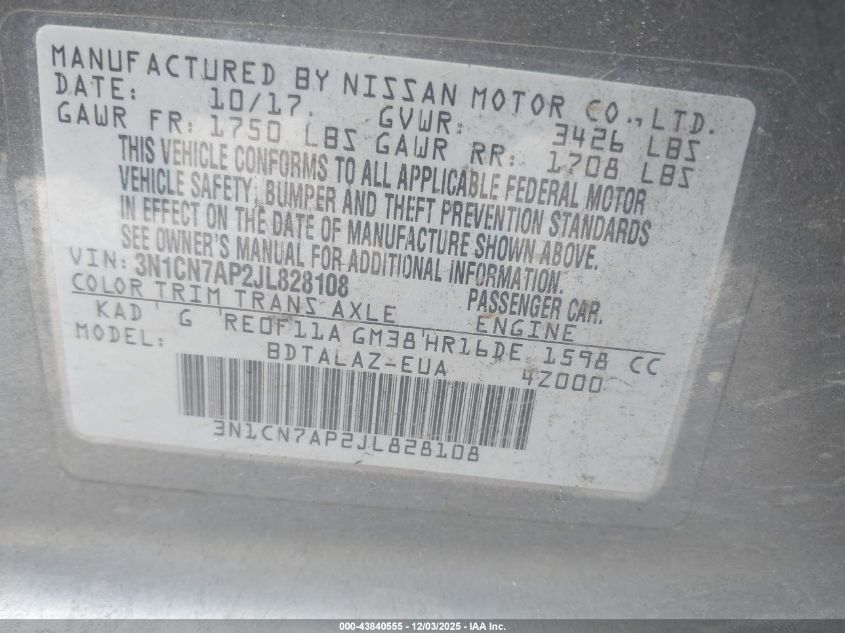 2018 NISSAN VERSA 2018 року Бензин, 1.6, Передний привод, vin - 3N1CN7AP2JL828108 из США