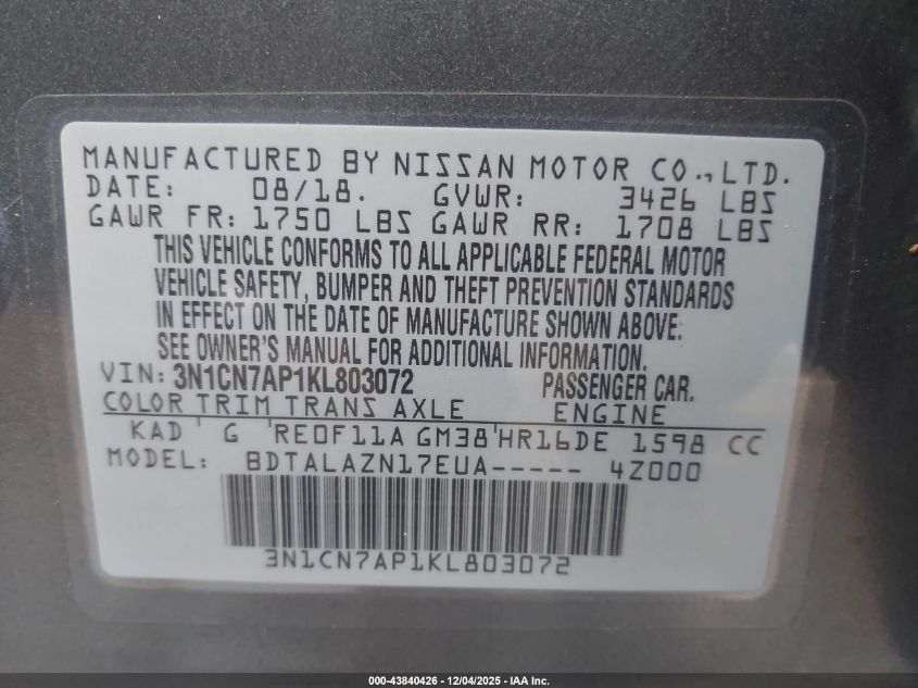 2019 NISSAN VERSA 2019 року Бензин, 1.6, Передний привод, vin - 3N1CN7AP1KL803072 из США