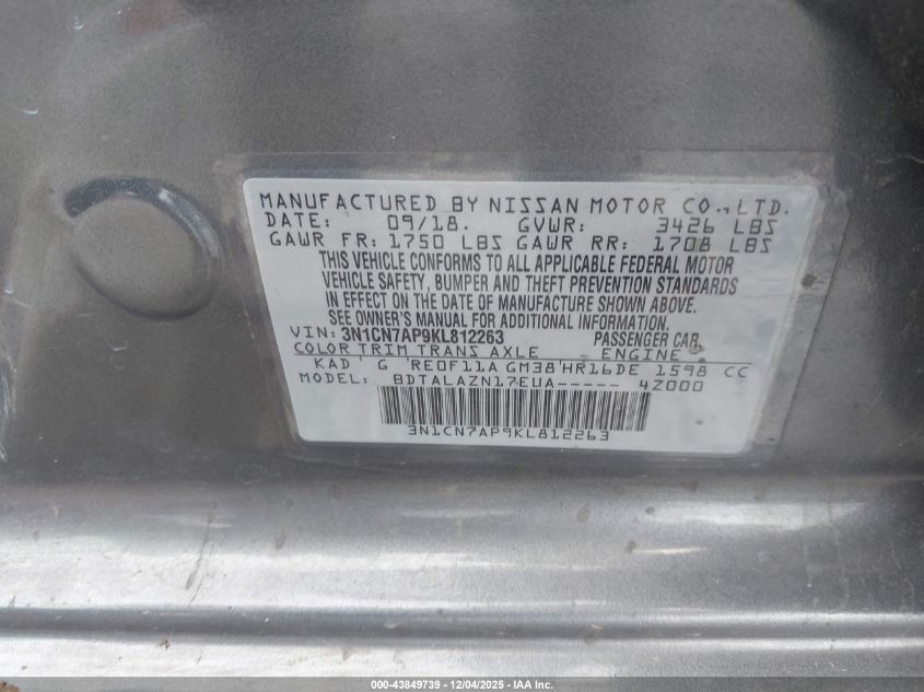 2019 NISSAN VERSA 2019 року Бензин, 1.6, Передний привод, vin - 3N1CN7AP9KL812263 из США