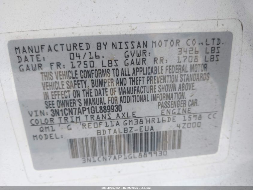 2016 NISSAN VERSA 2016 року Бензин, 1.6, Передний привод, vin - 3N1CN7AP1GL889930 из США