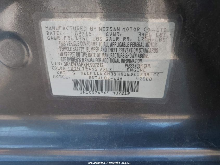2015 NISSAN VERSA 2015 року Бензин, 1.6, Передний привод, vin - 3N1CN7APXFL907212 из США