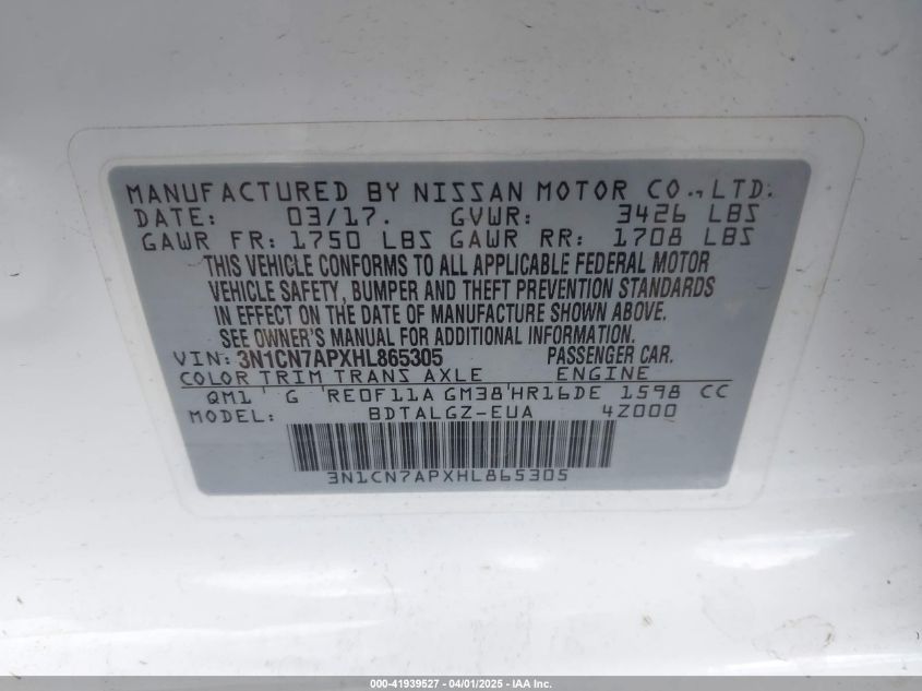 2017 NISSAN VERSA 2017 року Бензин, 1.6, Передний привод, vin - 3N1CN7APXHL865305 из США