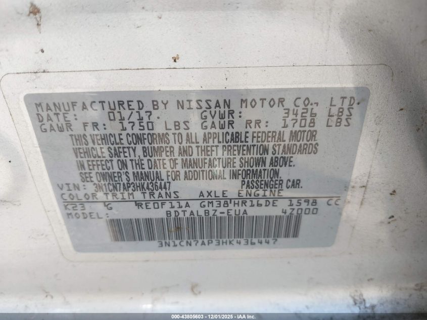 2017 NISSAN VERSA 2017 року Бензин, 1.6, Передний привод, vin - 3N1CN7AP3HK436447 из США