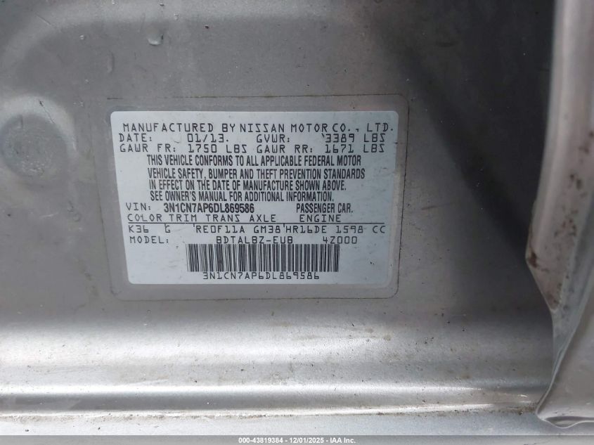 2013 NISSAN VERSA 2013 року Бензин, 1.6, Передний привод, vin - 3N1CN7AP6DL869586 из США