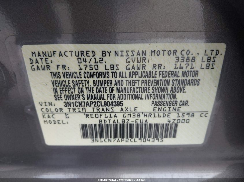 2012 NISSAN VERSA 2012 року Бензин, 1.6, Передний привод, vin - 3N1CN7AP2CL904395 из США