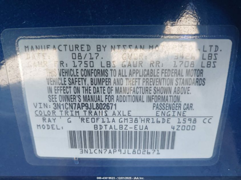 Цвет СинийЦилиндры 4Привод Передний приводVIN 3N1CN7AP9JL802671Состояние Заводится и едет (проверено)Повреждения Правая сторона AutoRIA
