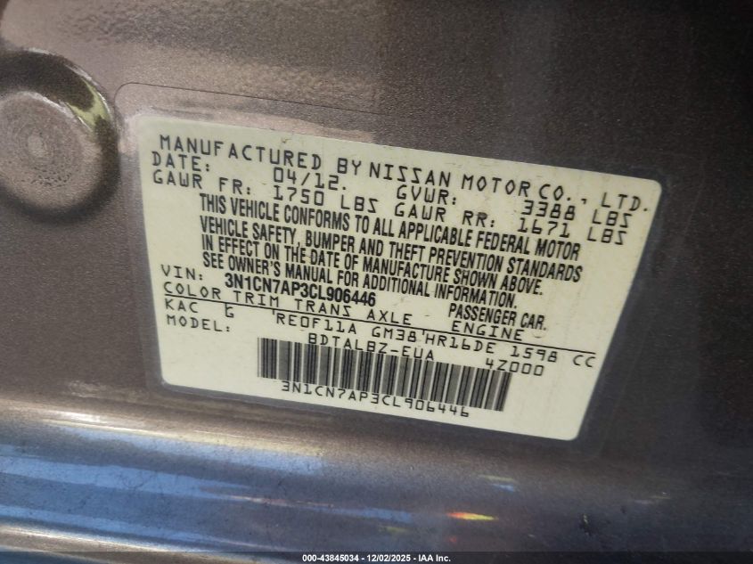 2012 NISSAN VERSA 2012 року Бензин, 1.6, Передний привод, vin - 3N1CN7AP3CL906446 из США