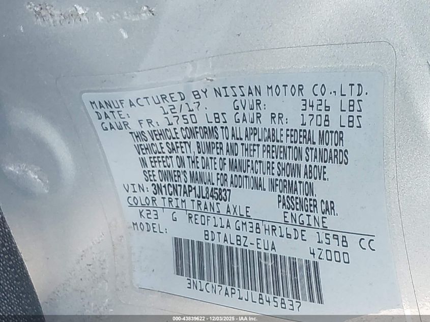 2018 NISSAN VERSA 2018 року Бензин, 1.6, Передний привод, vin - 3N1CN7AP1JL845837 из США