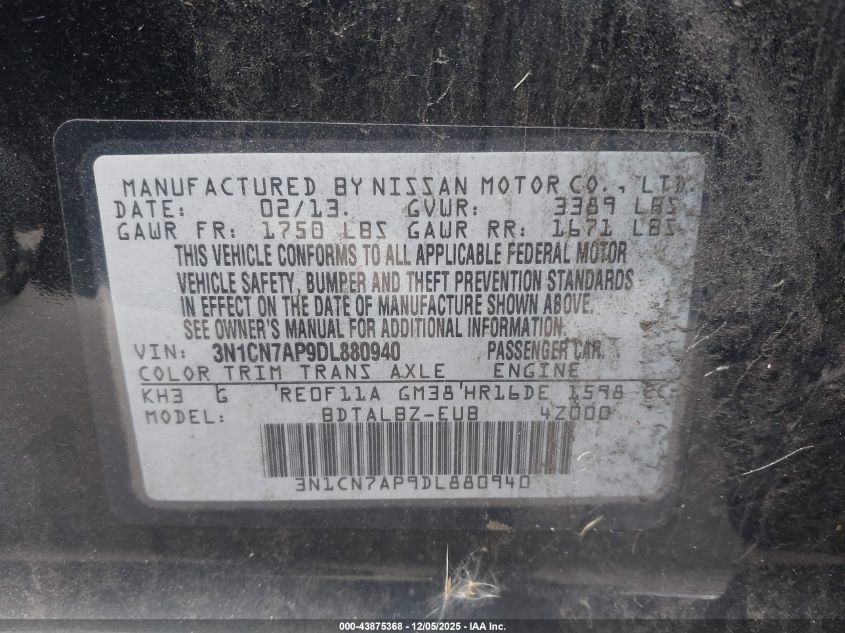 2013 NISSAN VERSA 2013 року Бензин, 1.6, Передний привод, vin - 3N1CN7AP9DL880940 из США