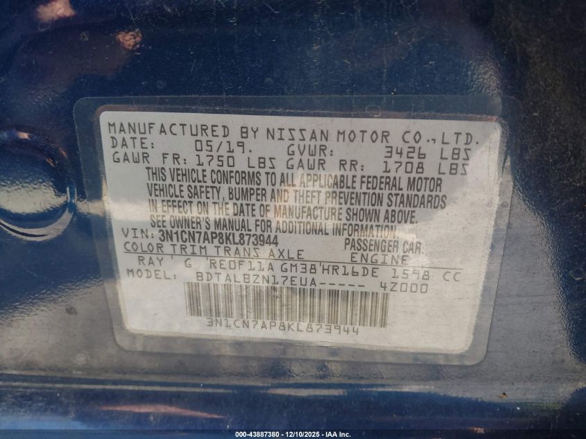 2019 NISSAN VERSA 2019 року Бензин, 1.6, Передний привод, vin - 3N1CN7AP8KL873944 из США