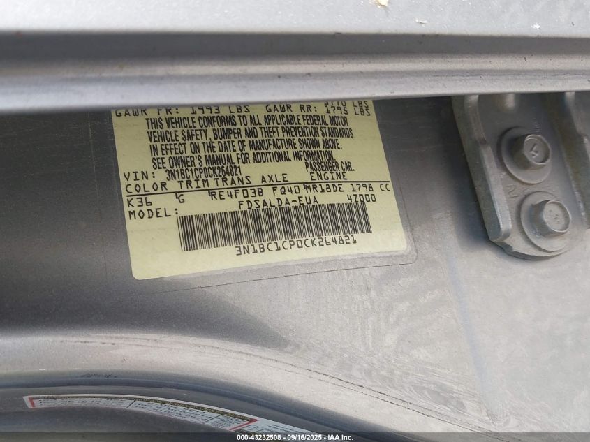 Цвет СеребряныйЦилиндры 4Привод Передний приводVIN 3N1BC1CP0CK264821Состояние Заводится и едет (проверено)Повреждения Передняя леваяДата аукциона 2025-12-10 AutoRIA
