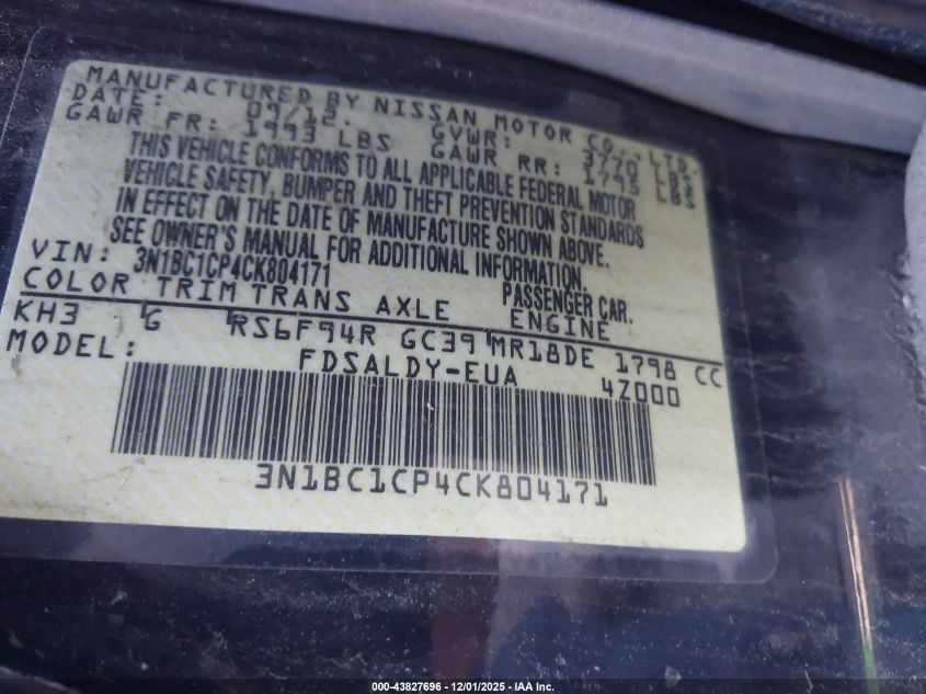 Цвет ЧерныйЦилиндры 4Привод Передний приводVIN 3N1BC1CP4CK804171Состояние ЗаводитсяПовреждения Передняя праваяДата аукциона 2025-12-16 AutoRIA