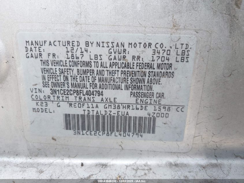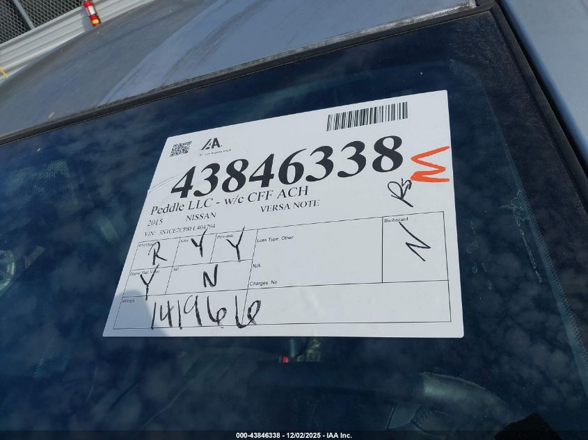 2015 NISSAN VERSA NOTE 2015 року Бензин, 1.6, Передний привод, vin - 3N1CE2CP8FL404794 из США