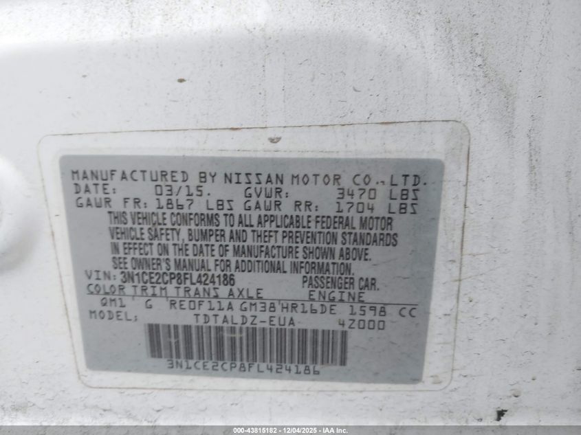 2015 NISSAN VERSA NOTE 2015 року Бензин, 1.6, Передний привод, vin - 3N1CE2CP8FL424186 из США