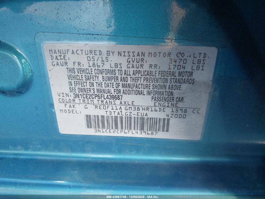 2015 NISSAN VERSA NOTE 2015 року Бензин, 1.6, Передний привод, vin - 3N1CE2CP6FL439687 из США