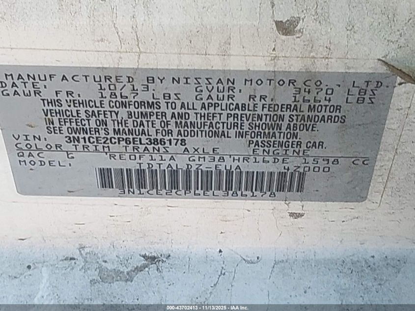 2014 NISSAN VERSA NOTE 2014 року Бензин, 1.6, Передний привод, vin - 3N1CE2CP6EL386178 из США
