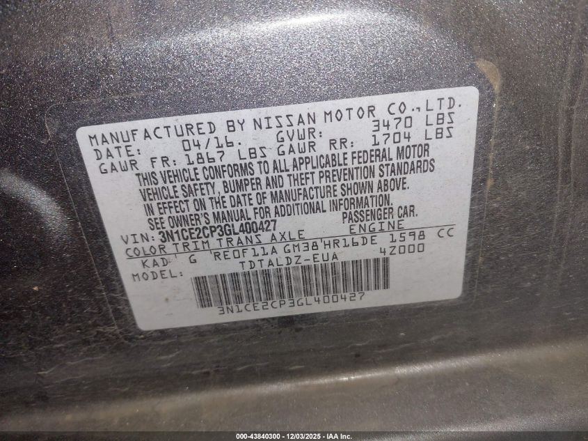 2016 NISSAN VERSA NOTE 2016 року Бензин, 1.6, Передний привод, vin - 3N1CE2CP3GL400427 из США
