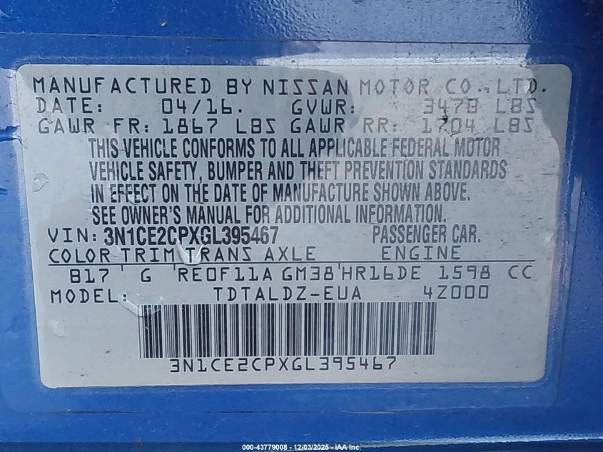 2016 NISSAN VERSA NOTE 2016 року Бензин, 1.6, Передний привод, vin - 3N1CE2CPXGL395467 из США