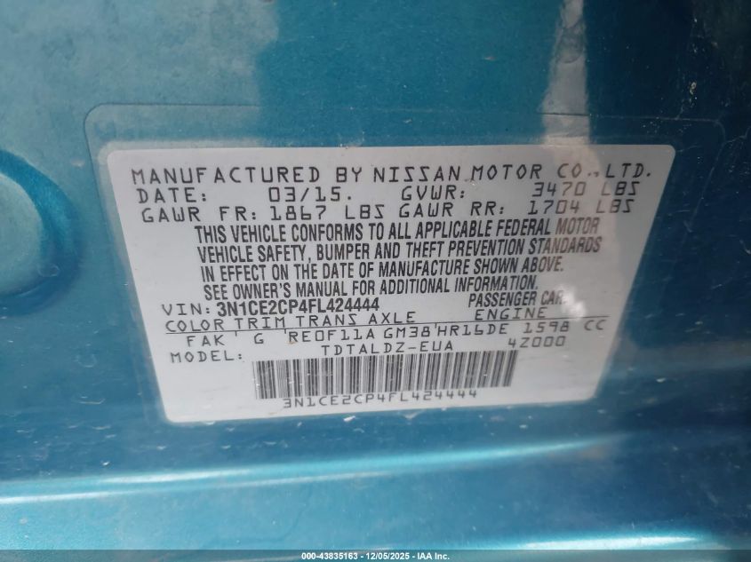 2015 NISSAN VERSA NOTE 2015 року Бензин, 1.6, Передний привод, vin - 3N1CE2CP4FL424444 из США