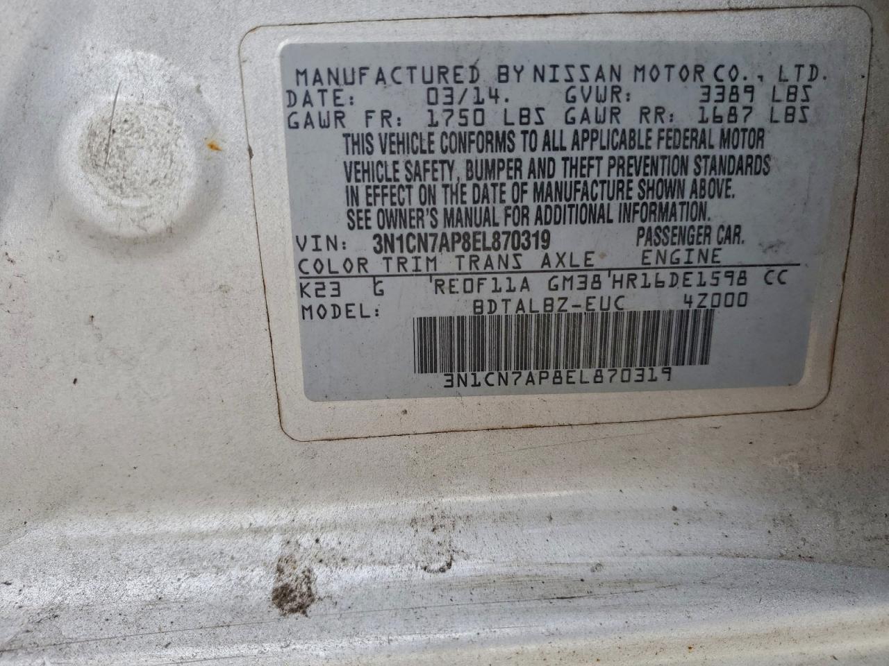 Цвет СерыйЦилиндры 4VIN 3N1CN7AP8EL870319Состояние Заводится и едет (проверено)Повреждения Обычный износДата аукциона 2025-12-09 AutoRIA