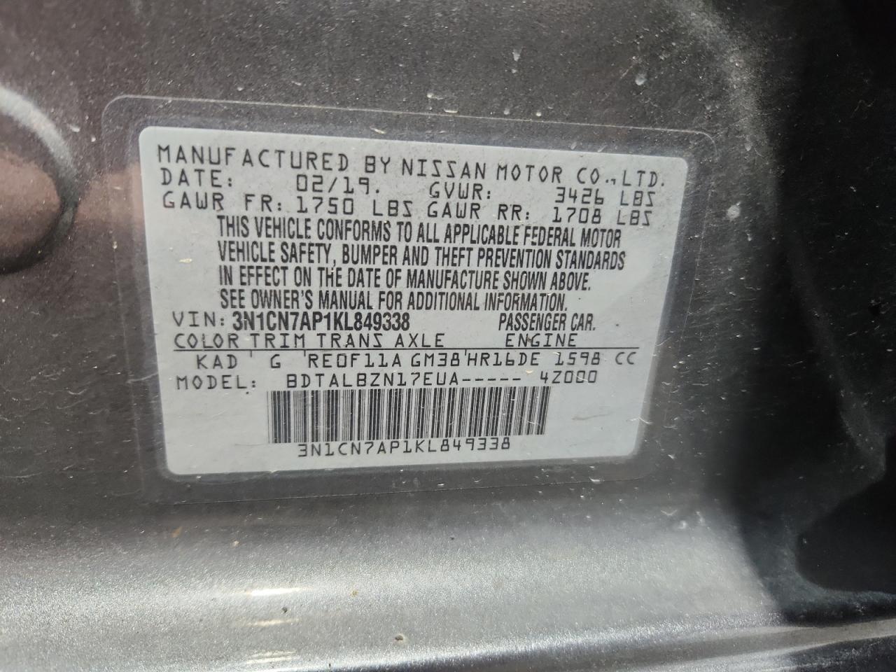 Цвет СерыйЦилиндры 4VIN 3N1CN7AP1KL849338Состояние Заводится и едет (проверено)Повреждения Передняя или задняя AutoRIA