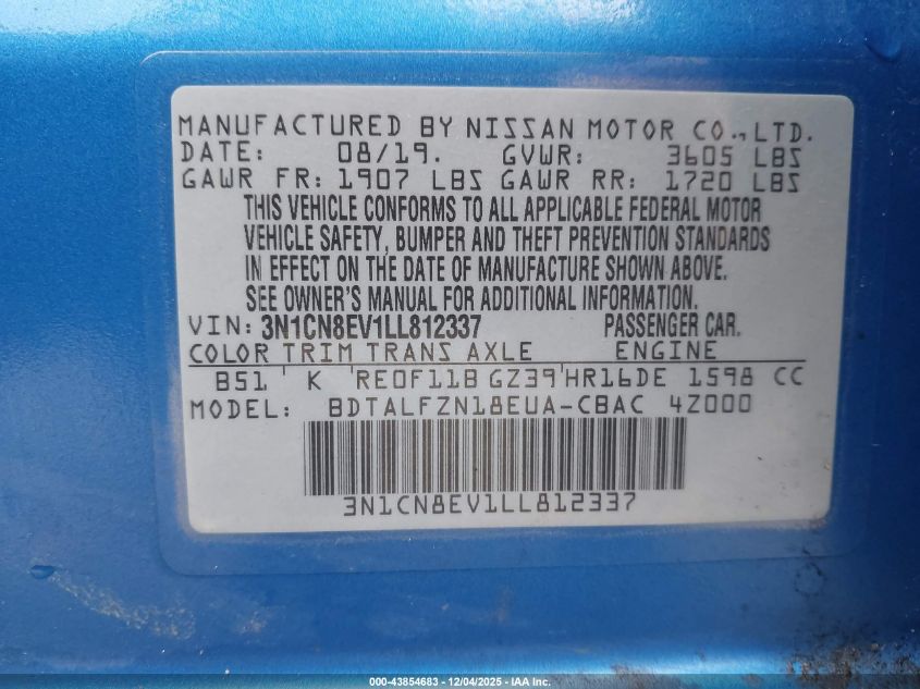 2020 NISSAN VERSA 2020 року Бензин, 1.6, Передний привод, vin - 3N1CN8EV1LL812337 из США