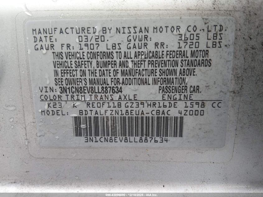 2020 NISSAN VERSA 2020 року Бензин, 1.6, Передний привод, vin - 3N1CN8EV8LL887634 из США
