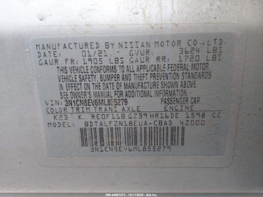 2021 NISSAN VERSA 2021 року Бензин, 1.6, Передний привод, vin - 3N1CN8EV6ML855279 из США