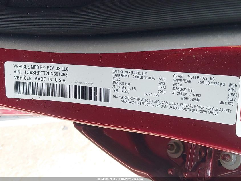 2020 RAM 1500 2020 року Бензин, 5.7, Полный привод, vin - 1C6SRFFT2LN391363 из США