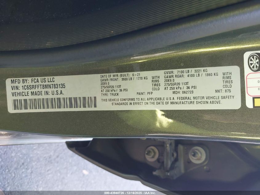 2021 RAM 1500 2021 року Бензин, 5.7, Полный привод, vin - 1C6SRFFT8MN783135 из США