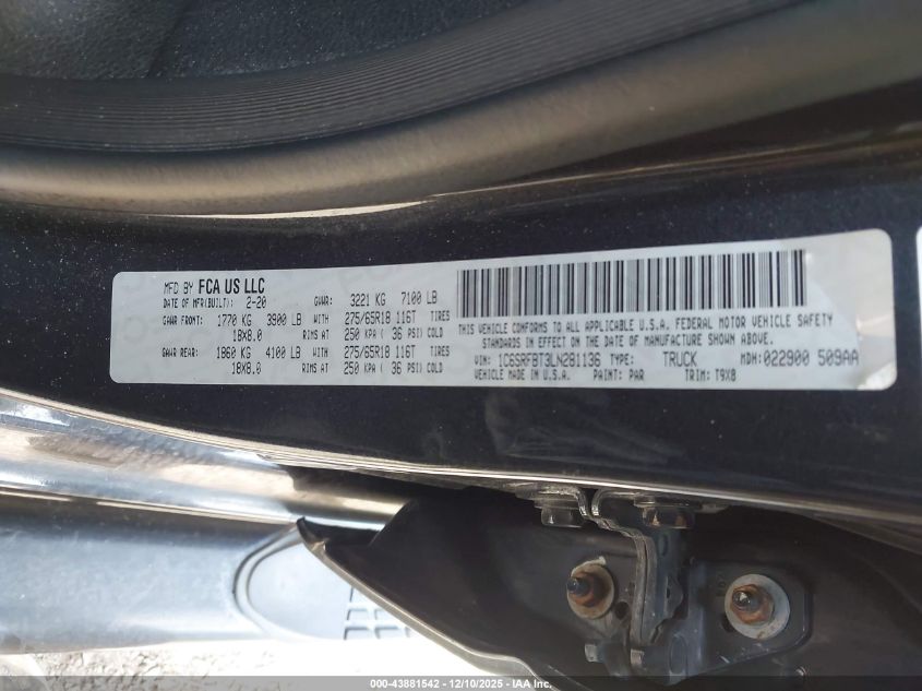 2020 RAM 1500 2020 року Бензин, 5.7, Полный привод, vin - 1C6SRFBT3LN281136 из США