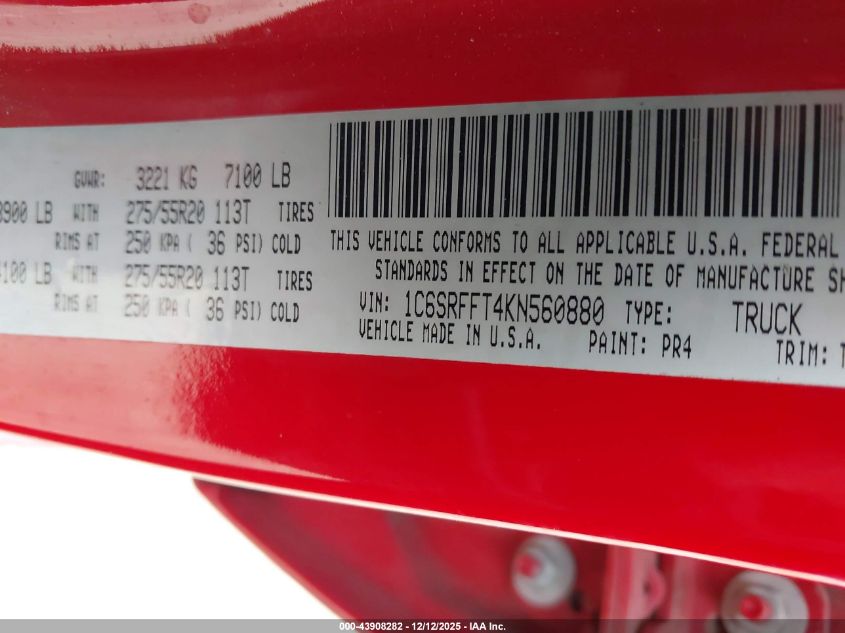 2019 RAM 1500 2019 року Бензин, 5.7, Полный привод, vin - 1C6SRFFT4KN560880 из США