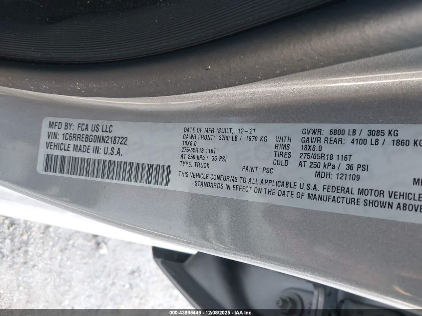 2022 RAM 1500 2022 року Бензин, 3.6, , vin - 1C6RREBG0NN218722 из США
