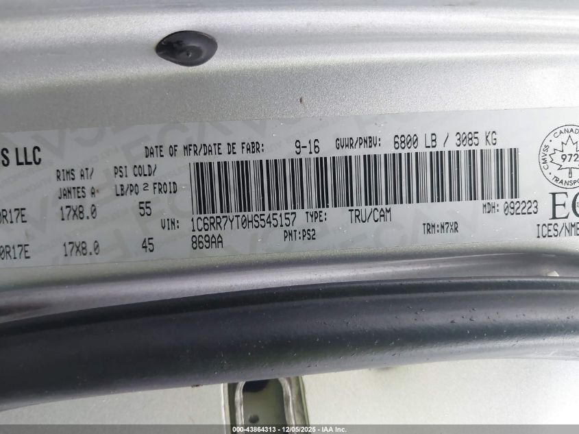2017 RAM 1500 2017 року Бензин, 5.7, Полный привод, vin - 1C6RR7YT0HS545157 из США