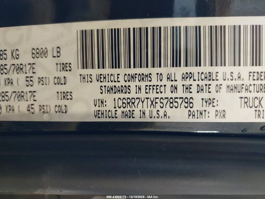 Цвет ЧерныйЦилиндры 8Привод Полный приводVIN 1C6RR7YTXFS785796Состояние СтационарноПовреждения Передняя или задняя AutoRIA