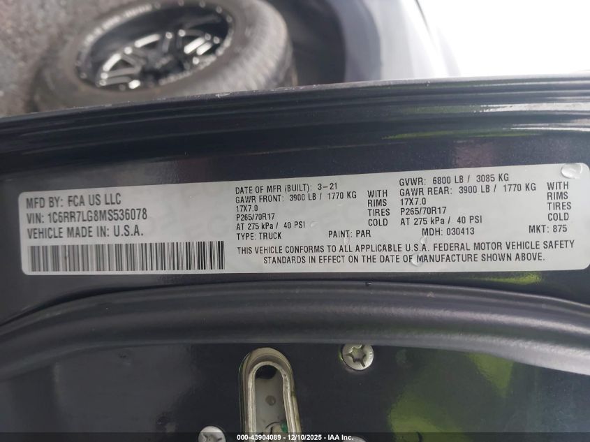 2021 RAM 1500 2021 року Бензин, 3.6, Полный привод, vin - 1C6RR7LG8MS536078 из США