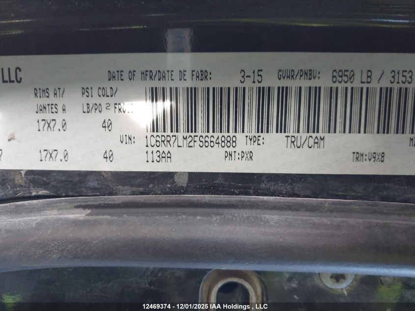 Цвет ЧерныйЦилиндры 6Привод Полный приводVIN 1C6RR7LM2FS664888Состояние СтационарноПовреждения ЭлектрикаДата аукциона 2025-12-11 AutoRIA