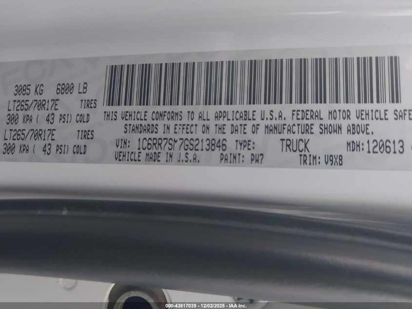Цвет БелыйЦилиндры 6Привод Полный приводVIN 1C6RR7SM7GS213846Состояние Заводится и едет (проверено)Повреждения Передняя правая AutoRIA